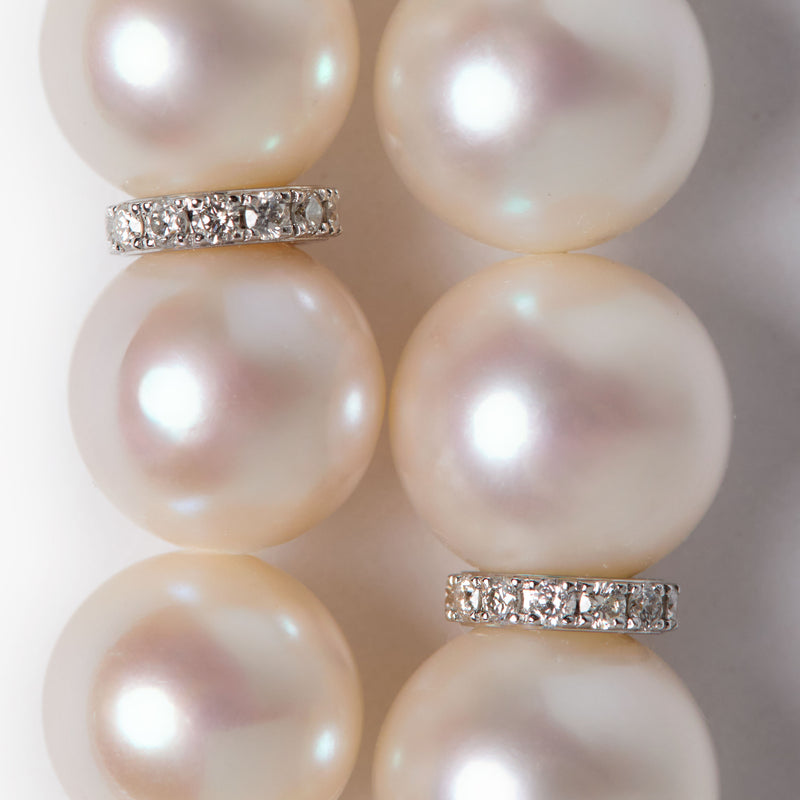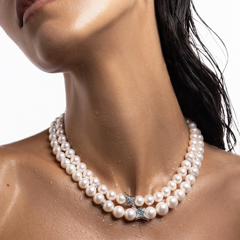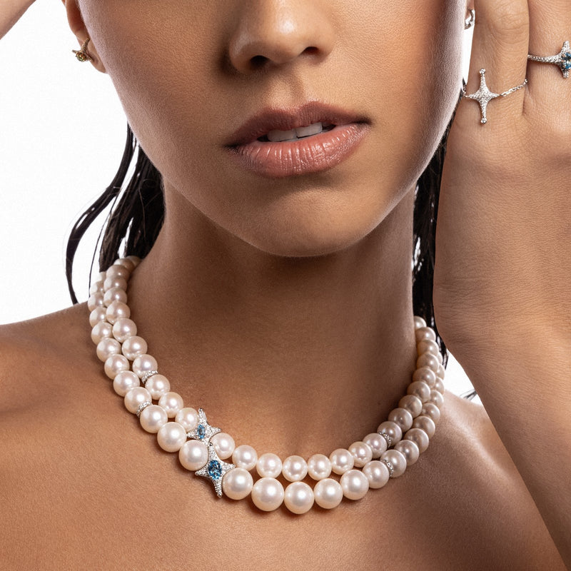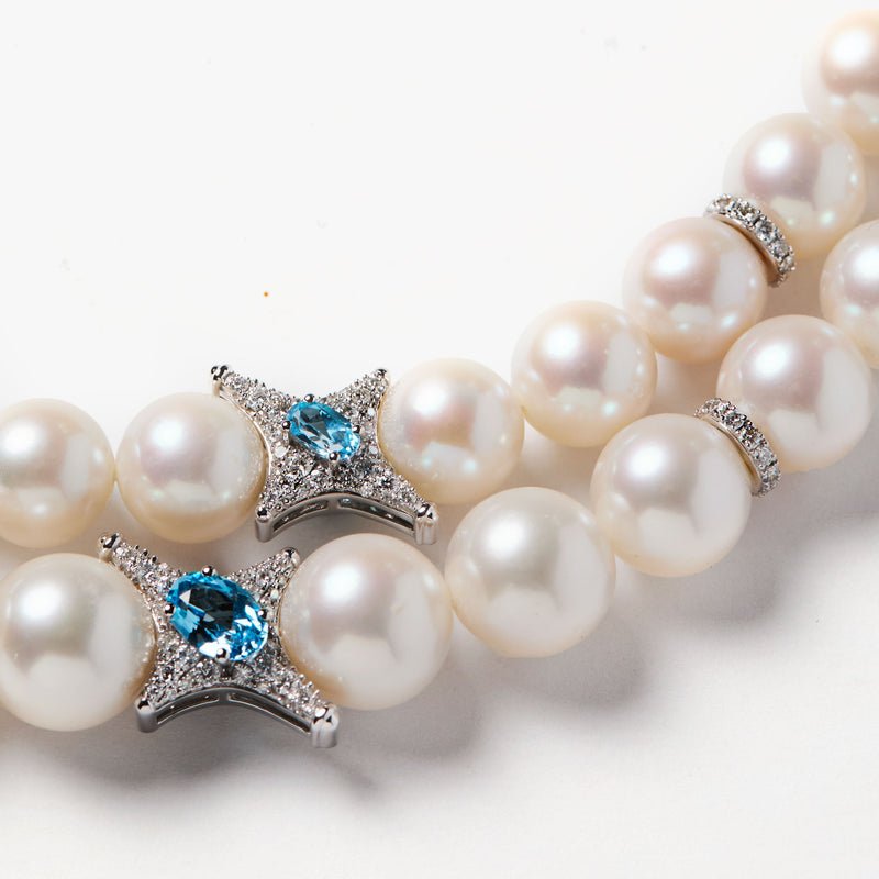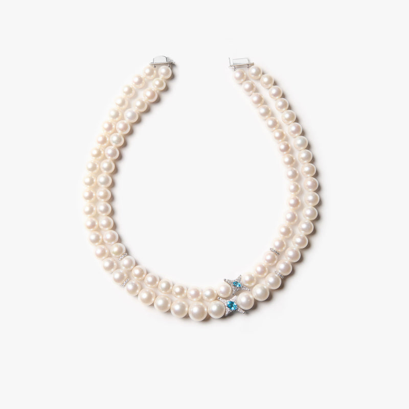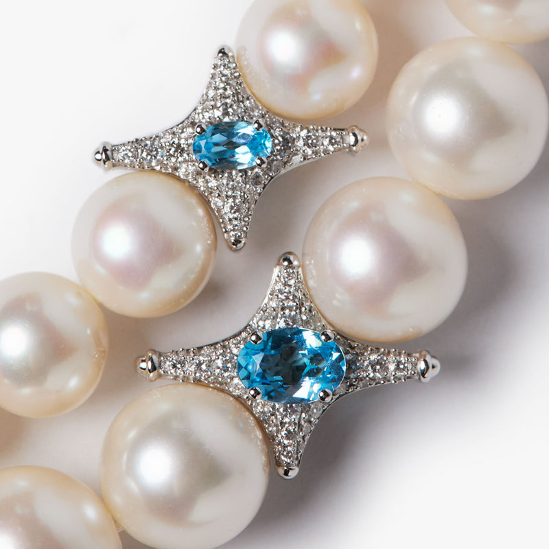 The Nereide Pearl Necklace features two strands of pearls with white gold sword-inspired pendants, each set with an oval-cut blue topaz. Diamond-set disc beads add subtle detailing to the round fresh-water pearls. This statement piece balances the celestial and oceanic inspirations of the collection, where delicate beauty and strength blend in perfect harmony.