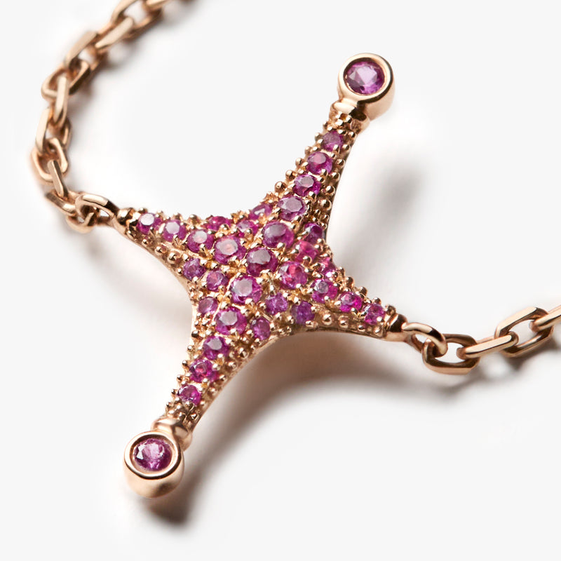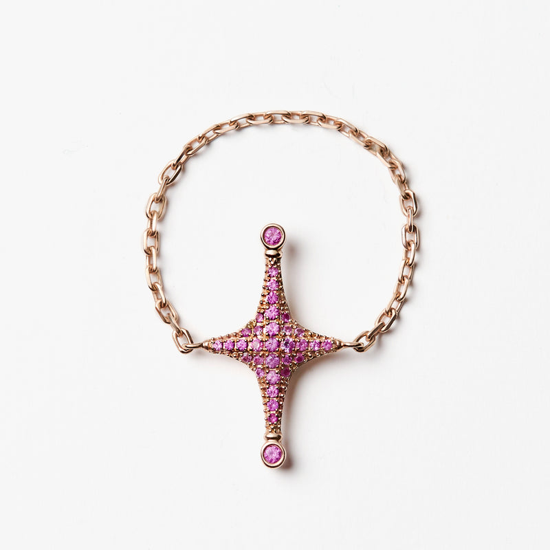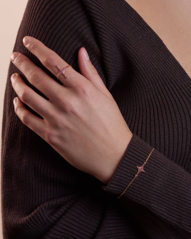 Crafted in 18k solid gold and set with pink sapphires in a pavé setting, the Aurora ring takes its form from the iconic Saudi sword—a design that blends strength with an unmistakable beauty.