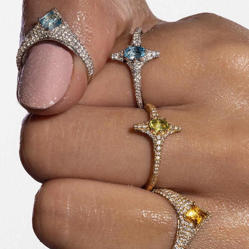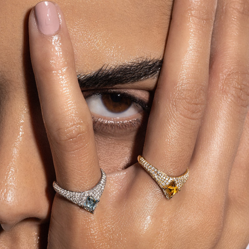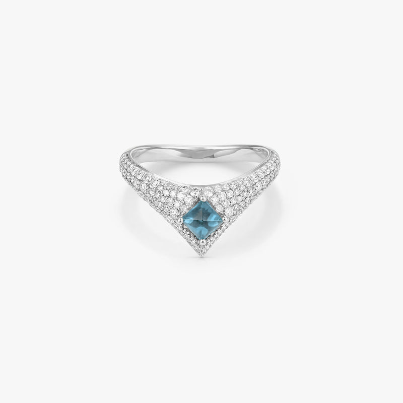 The Tidal Ring showcases a bold, angular design with pavé-set diamonds tapering along the band, and a square-cut blue topaz at its center. Reflecting the fluidity of water, this ring is part of the Selene collection and blends delicate beauty with a powerful presence. It adds a striking contrast to any ring stack.