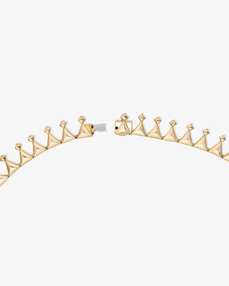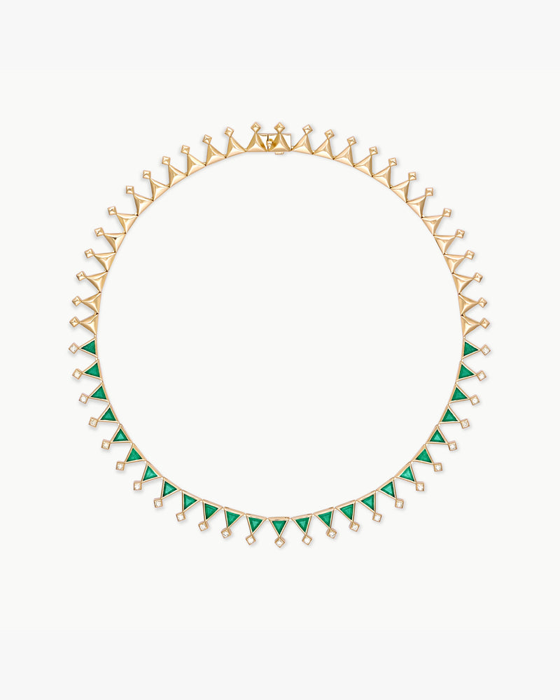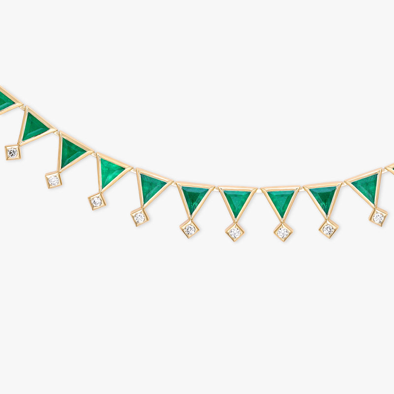 The Sahra necklace is part of the Foug collection, blending traditional artistry of Saudi Arabia with a modern flair. This tennis necklace is handcrafted in 18k yellow gold and set with 25 triangle-cut gemstones and 25 round-cut diamonds.